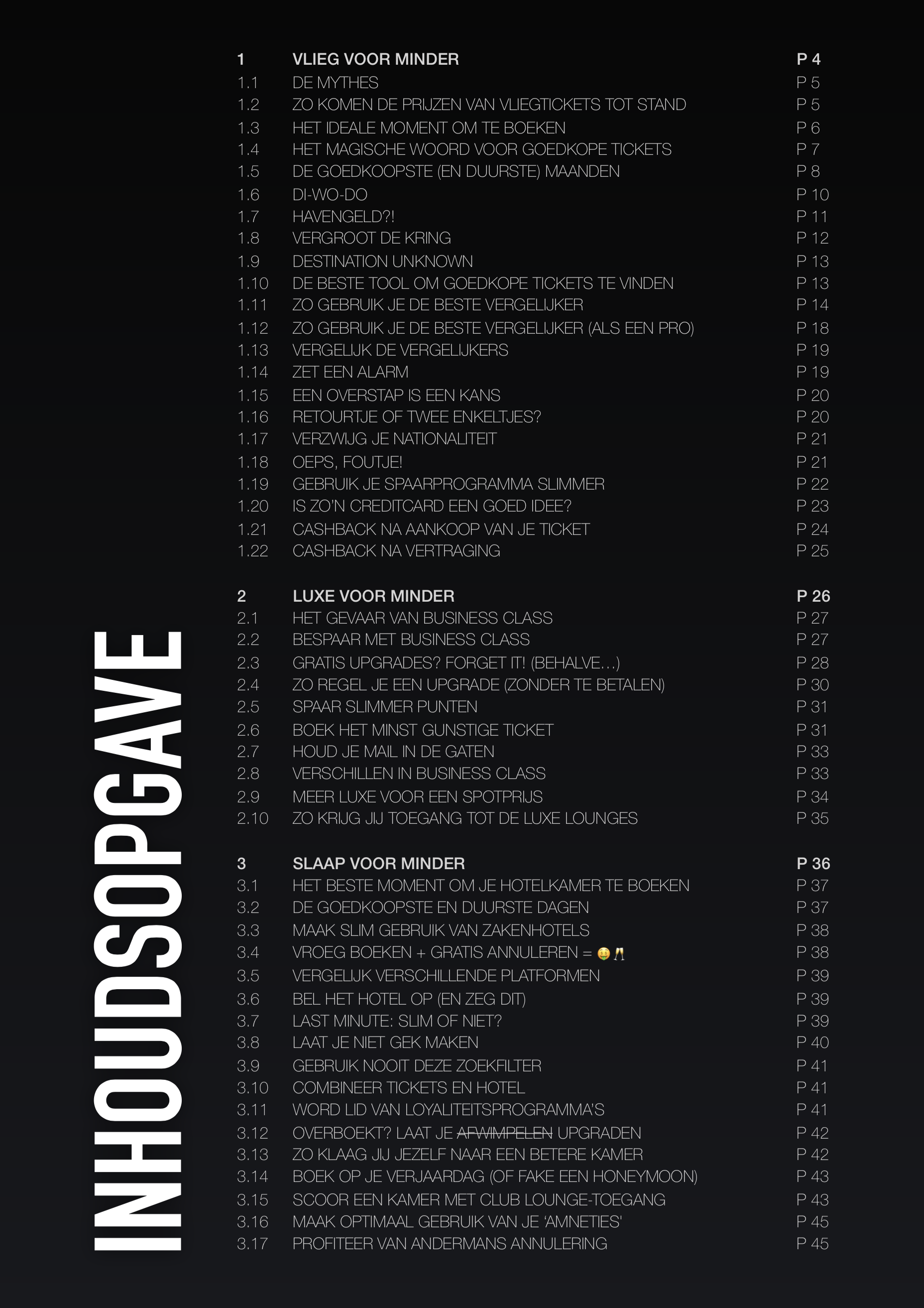 Deze inhoudsopgave geeft je alvast een idee van wat je kunt verwachten. Maar als je achteraf toch teleurgesteld bent, storten we de 7 euro met liefde weer terug.